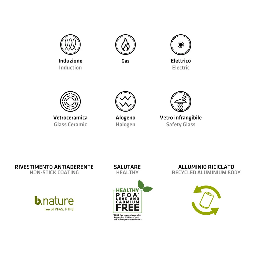 Finegres: innovativo rivestimento antiaderente naturale, privo di PFAS, PTFE, PFOA, NICHEL e metalli pesanti. E' resistente ai graffi e all'uso intensivo. La sua alta efficienza energetica permette la trasmissione del calore più velocemente, facendo così risparmiare tempo ed energia. Oggi con una nuova formula, ancora più antiaderente. Colore nero.
