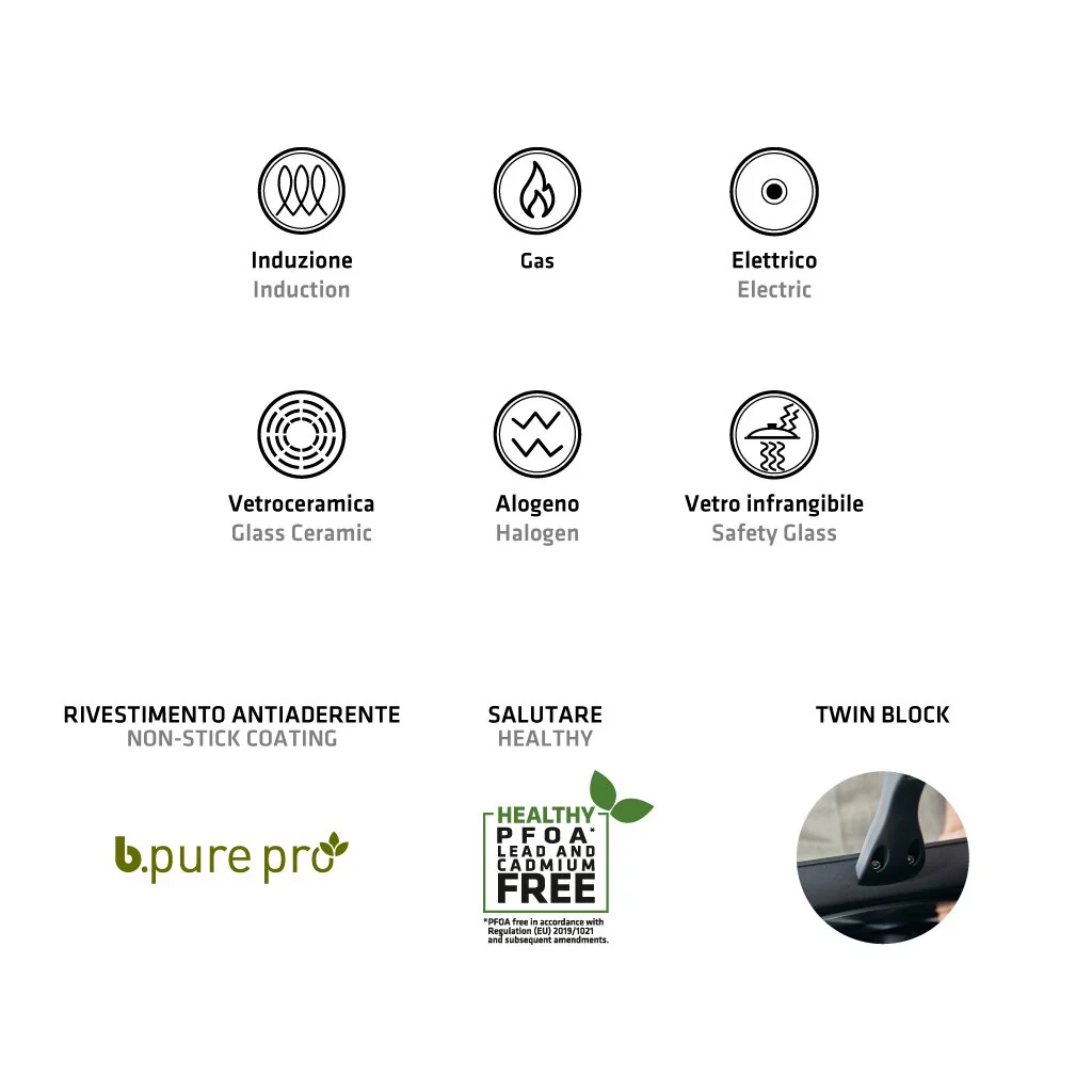 FONDO ad INDUZIONE: La base a induzione è realizzata in acciaio ferromagnetico e, oltre al riscaldamento rapido, consente un'elevata efficienza energetica. Adatto a tutti i tipi di piastre.