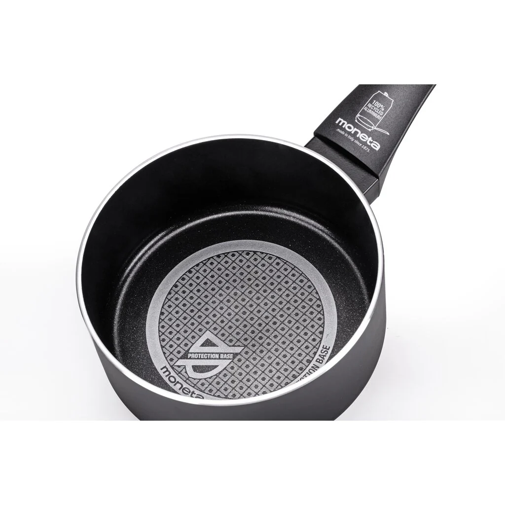 Rivestimento Protection Base: uno scudo per la tua pentola; è il sistema di applicazione brevettato Moneta che garantisce doppia durata e resistenza dell’antiaderenza.Durante la verniciatura viene aggiunta una tecno-superficie intermedia sulla base antiaderente e un ulteriore strato protettivo con micro-cristalli in grado di rinforzare e sigillare l’intera superficie. No PFOA, No Nichel, No Bisfenolo A.